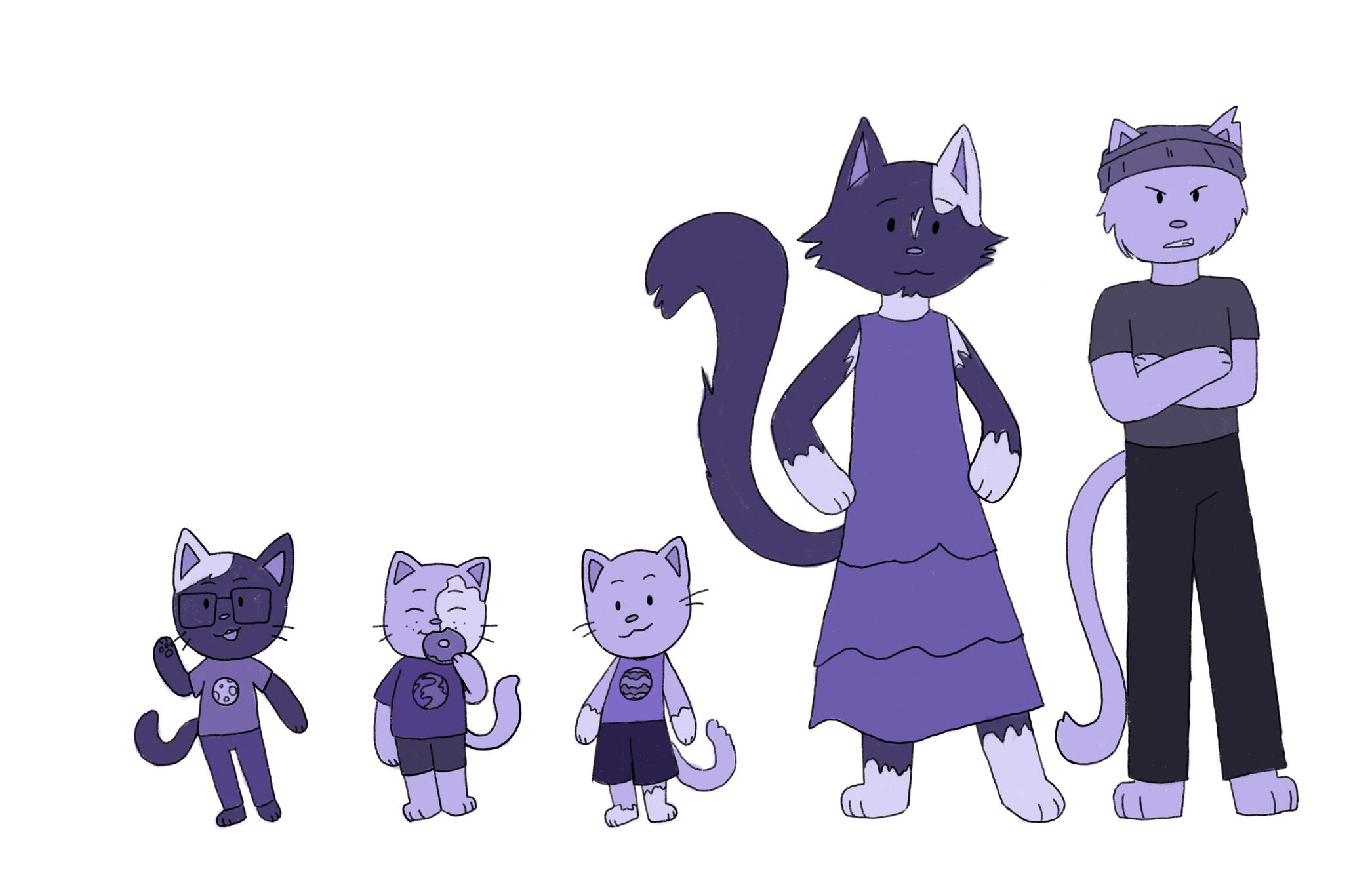 These designs were based on the ones we came up with as kids, but I wanted to refine them and standardize them so that I could draw them more easily. One thing I wanted to show in these designs was that each kitten is supposed to represent one of the girls. Some of the design choices show that, but the main indication is the graphic on their shirts. Roxie has a moon, Tigy has Mars, and Lily has Venus.